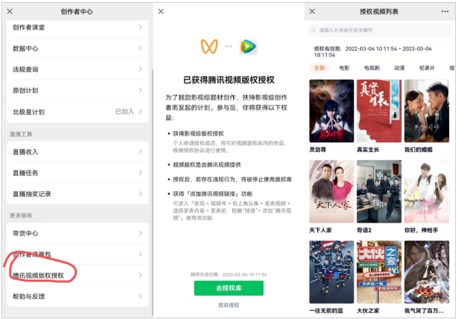 视频号继上线服务菜单功能,主页可直接跳转小程序之后,该平台有新增腾讯视频版权授权功能。